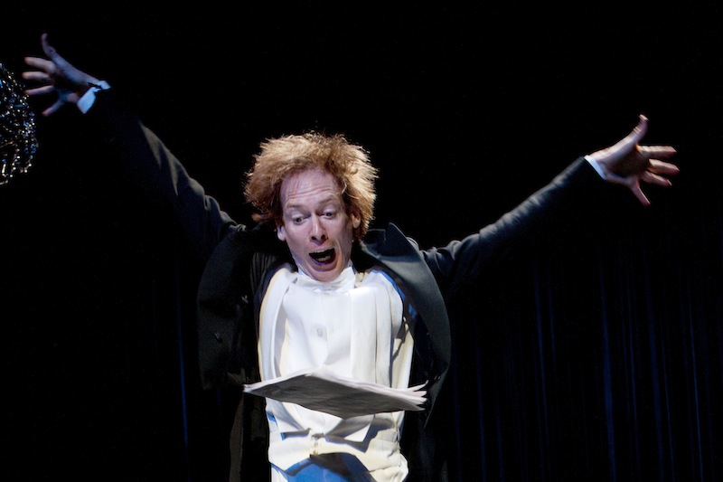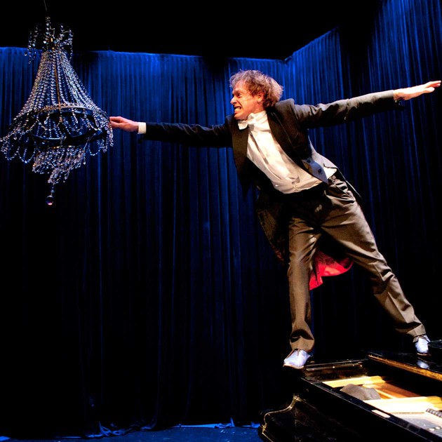 Een concertvleugel, een feeërieke kroonluchter en een pianist. Tot zover niets aan de hand. Hoewel? Alleen opkomen is al een hele toer voor ‘pianist’ Thomas Monckton, laat staan spelen. Een uur lang gebeuren er de gekste dingen rond de vleugel, maar het klavier wordt nauwelijks beroerd. Met zijn cartooneske uiterlijk – lange slungel met schrikogen en een rechtopstaande, rossige kuif – geeft Monckton de klassieke concertpraktijk een totaal ander aanzien. Hij duikt ín de vleugel, danst óp de vleugel, kruipt ónder de vleugel. En die kroonluchter hangt daar natuurlijk ook niet voor niets. Maar muziek maken? Ho maar.